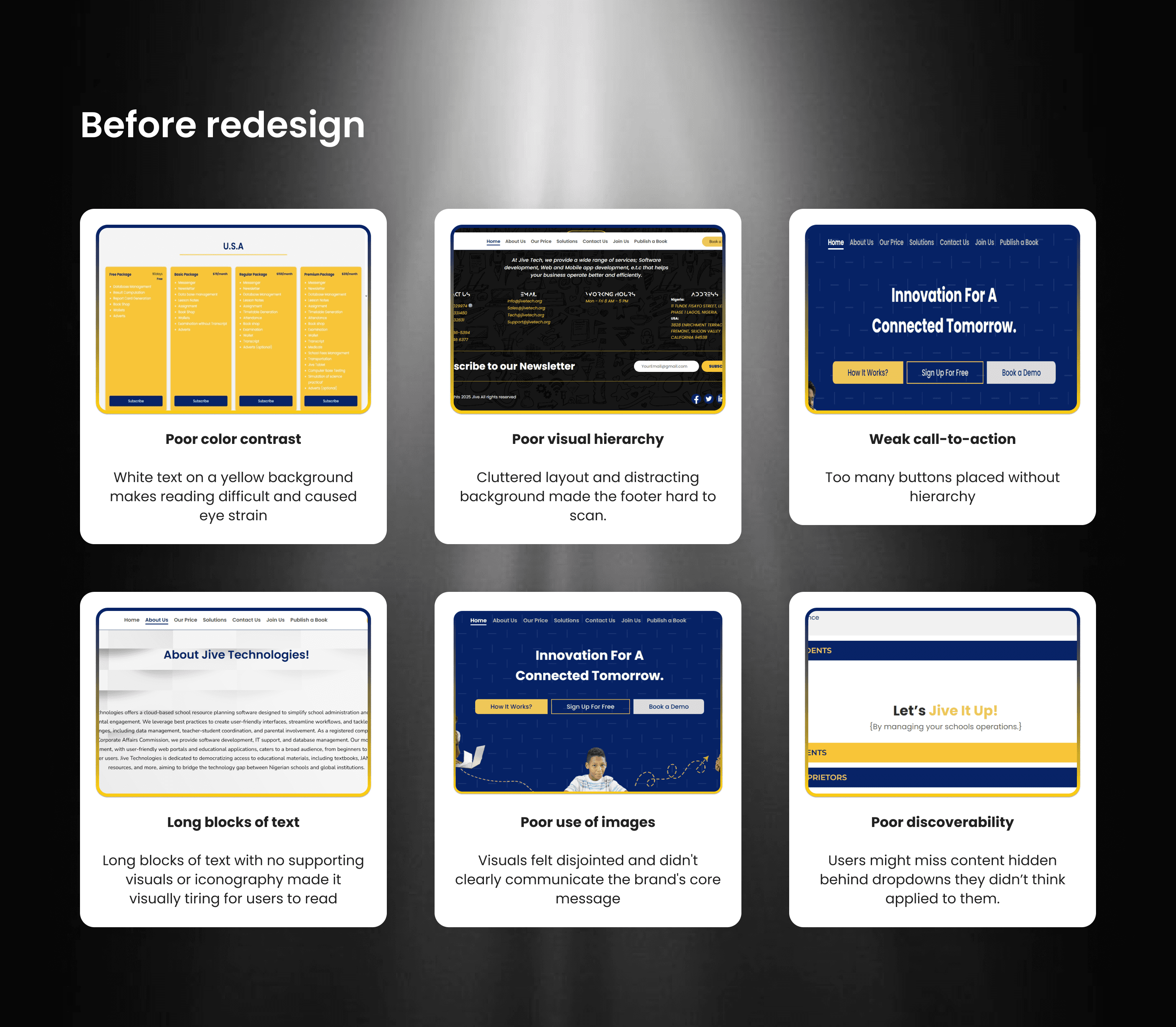 One major challenge I encountered during my evaluation was that the original website attempted to highlight too many things at once, resulting in a lack of focus.