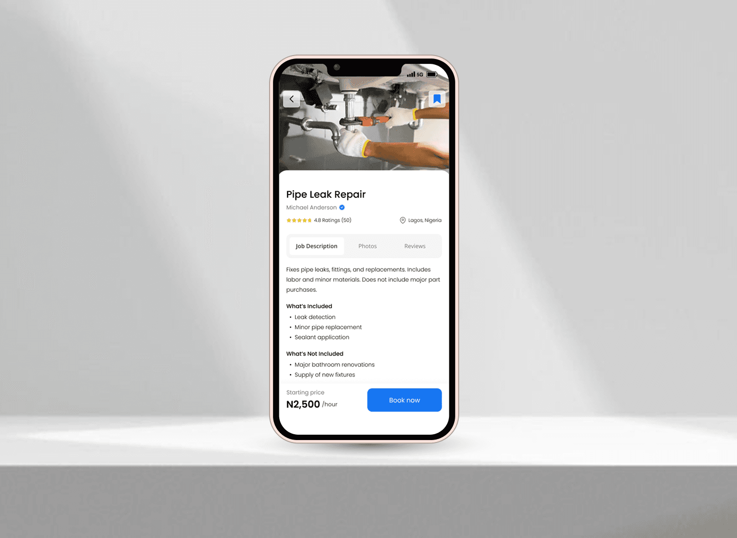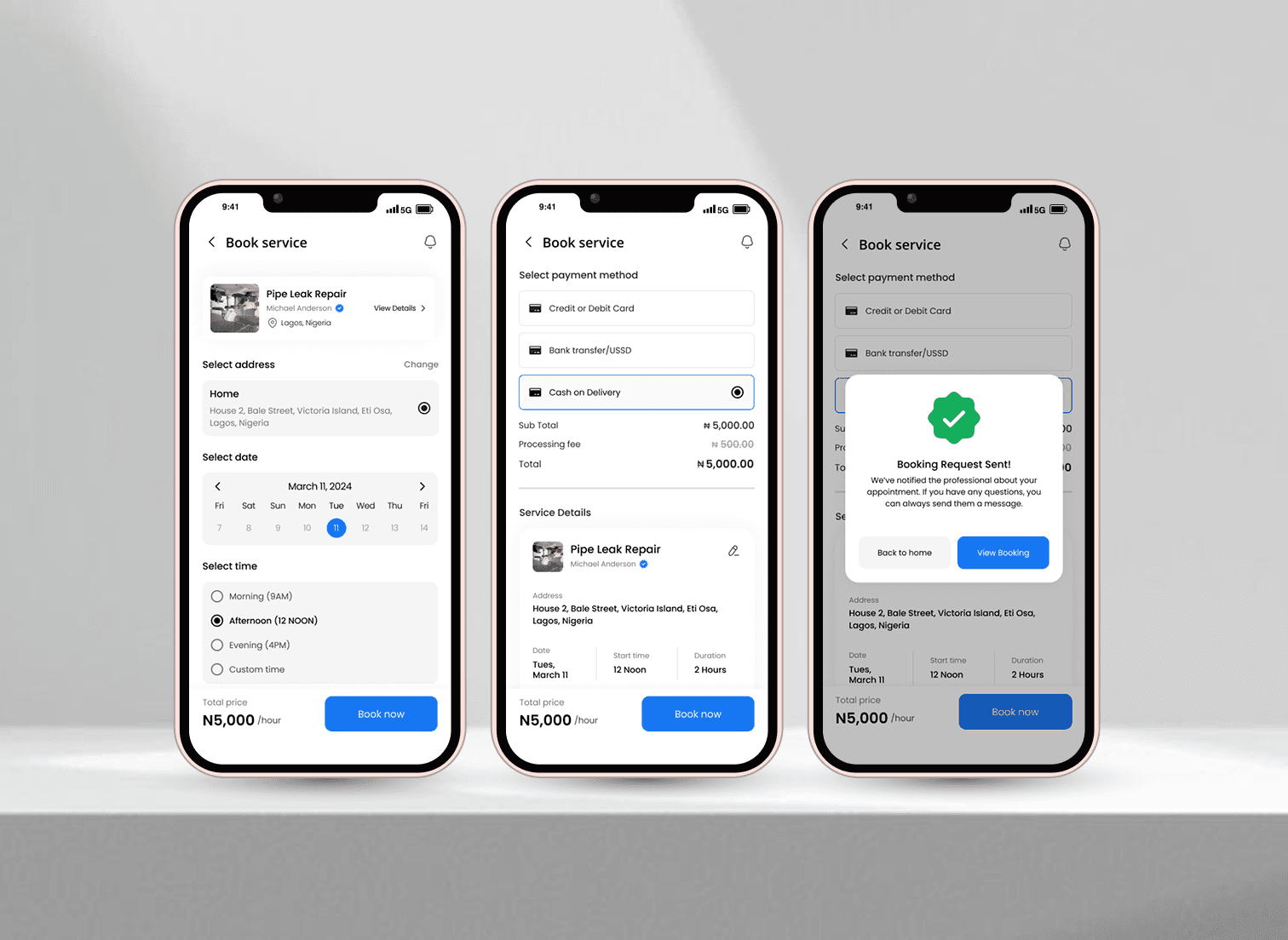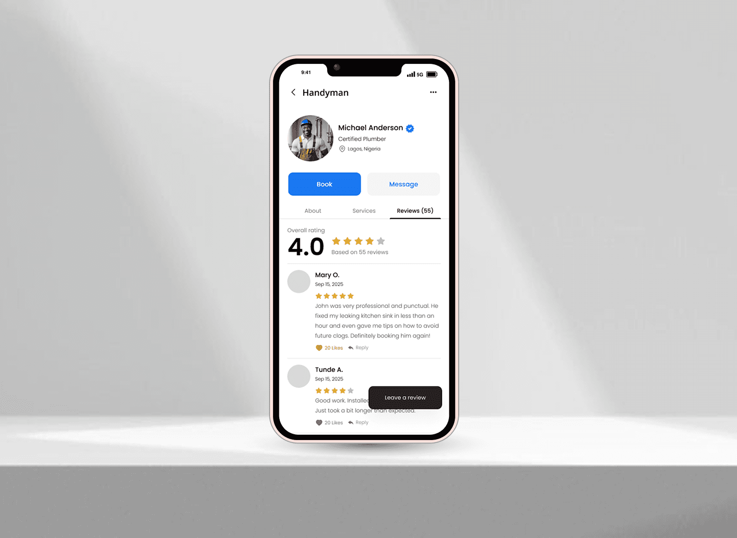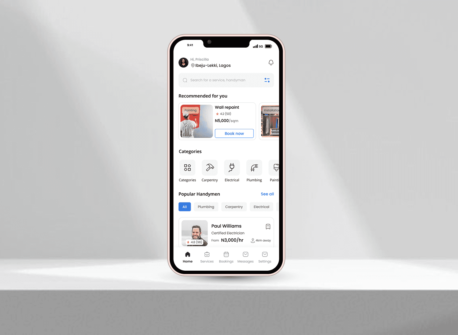 Challenge: Finding a reliable plumber, electrician, or carpenter in a busy city like Lagos is a frustrating process. Homeowners often rely on word-of-mouth, leading to a lack of trust, inconsistent pricing, and no way to verify the quality of work before hiring. The process is stressful and time-consuming.